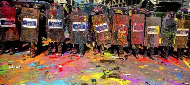 Permítanme la frivolidad, suspendamos por un momento los juicios políticos, esta imagen es una belleza. Si no conociéramos la miseria estética de quienes han provocado esta escena, parecería una magnífica performance: unos guerreros que acaban de pelear contra un monstruo policromático, una alucinación lisérgica, unas fuerzas del orden figurativo tratando de contener una revolución pollockista, se me ocurren mil cosas… todas mejores que la realidad.