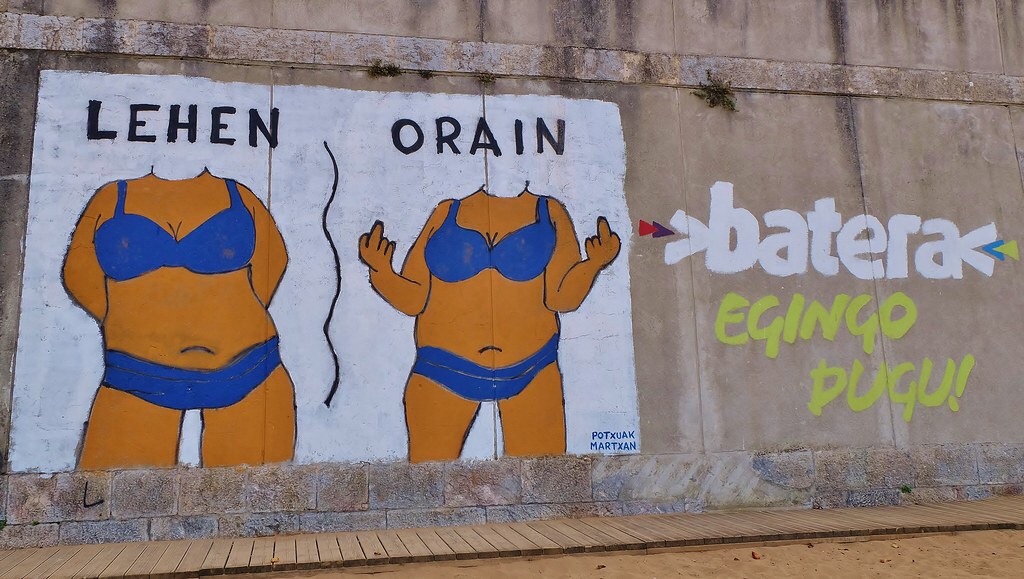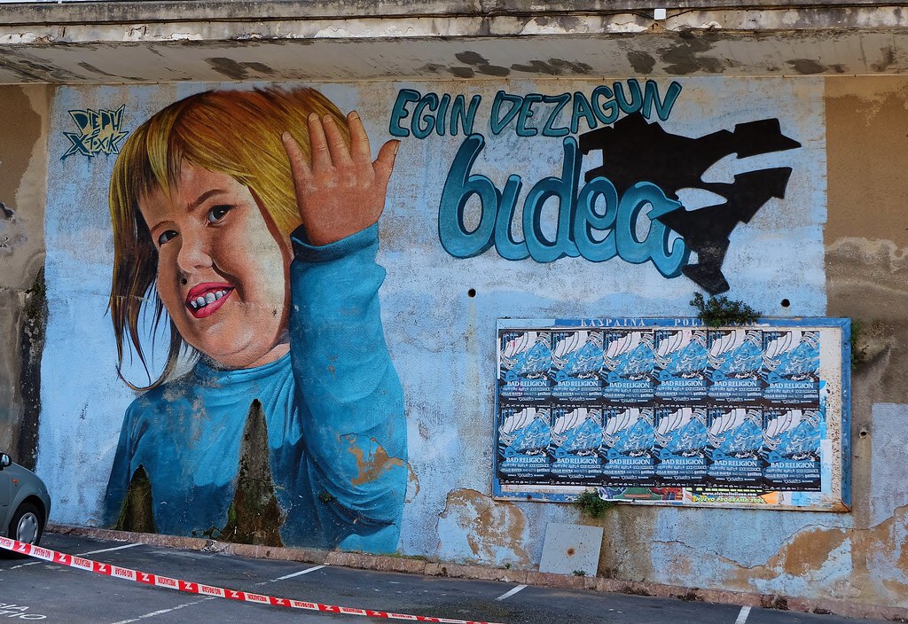 La exposición de Jon Bienzobas es una manifestación más de la extraña relación que tienen los batasunos con el arte, pero ejemplos de esto hay miles. En Lequeitio, pueblo al que quiero mucho y conozco bien, hay varios atentados estéticos en los lugares que más duelen. Pongo dos ejemplos: arriba una pintada de muchos metros cuadrados en el paseo que hay en frente del mar, con una niña terrorífica con una mano deforme y dientes de critter. En una población con mínimo espíritu crítico aplicado a la estética, habrían borrado ya este depropósito hace años, pero ahí se mantiene la cosa. Es peor aún la pintada que hay en el muro que separa el parque y la playa, un poco más abajo. Verdaderamente cuesta creer que alguien que ama su lugar en el mundo tenga la necesidad de pintarrajearlo de esta manera, es un tipo de amor tóxico, como aquellas gentes que le tatúan a las mujeres el símbolo de la tribu del padre en la cara, para que todos sepan a quien pertenece esa cara.