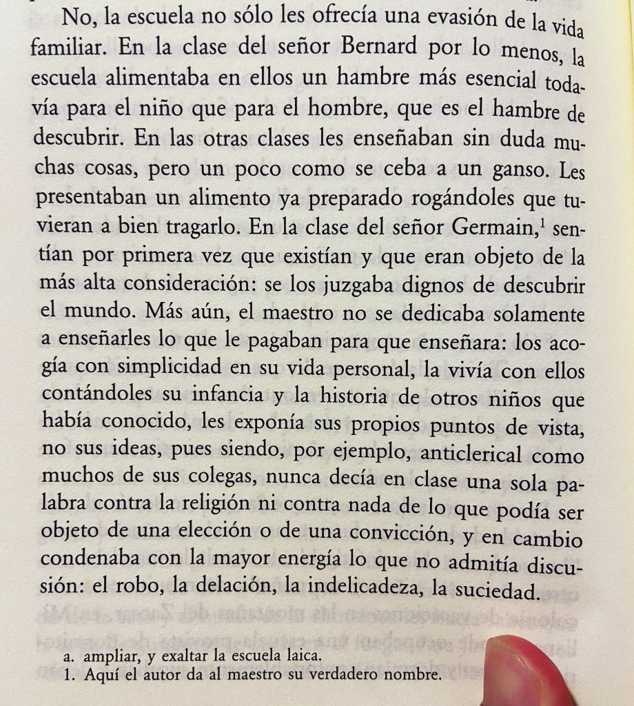 Ahora que los colegios están cerrados, me he topado con este pasaje que me ha impresionado. Con qué agradecimiento y con qué cariño habla Camus del profesor que le descubrió todo un mundo al que de otro modo, siendo hijo de una inmigrante española analfabeta y viuda, jamás podría haber accedido: el de la literatura y la filosofía. Es maravillosa la manera en que Camus celebra en “El primer hombre” aquello que hubo de bueno en su dura infancia de pied-noir pobre. Ni una sola línea de rencor o de amargura, ni exhibición vanidosa de la miseria superada, ni revanchista orgullo de clase, ni complacencia alguna, solo una mirada llena de ternura, amabilidad y comprensión hacia la gente que le tocó a su lado y los barrios de su infancia argelina. Imposible no preguntarse por cuántos niños -que como Camus, solo salen de la sordidez de sus familias cuando están en el colegio- estarán contando los días para volver junto a ese profesor que les ofrece la posibilidad de imaginar para ellos una vida distinta.