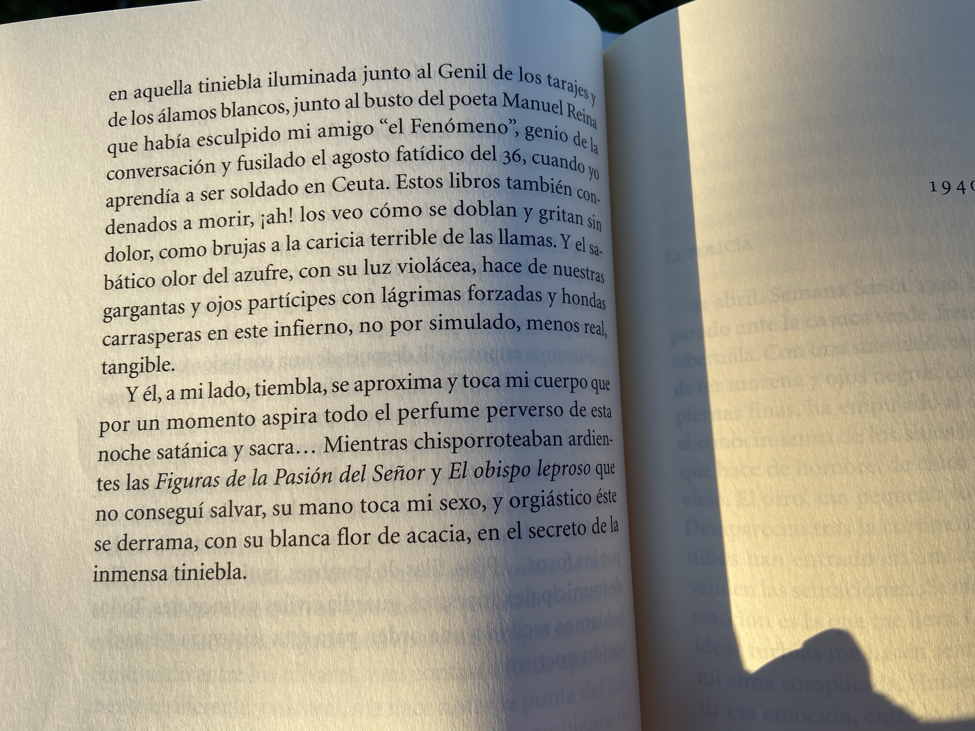 Comparto un pasaje donde Bernier describe un encuentro sexual temerario en Puente Genil, donde ha sido desterrado y trabaja como maestro de escuela, justo después de haber sido desmovilizado tras la guerra. Este encuentro transcurre en un momento de quema de libros, fusilamientos de rojos en la tapia del cementerio y misas de cuatro horas a las que se obliga a todo el pueblo a asistir.