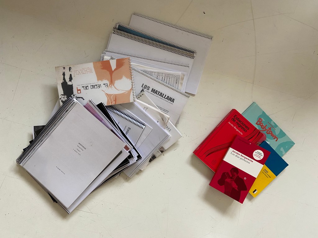 Textos que se quedan en un cajón vs textos que terminan publicados. Mi homenaje a Johan Deckmann. El montón de la izquierda son todo guiones. A la derecha cuento infantil, poesía, ensayo y novela. He cobrado más por el montón de la izquierda, a pesar de que todos son proyectos descartados, que por el de la derecha.