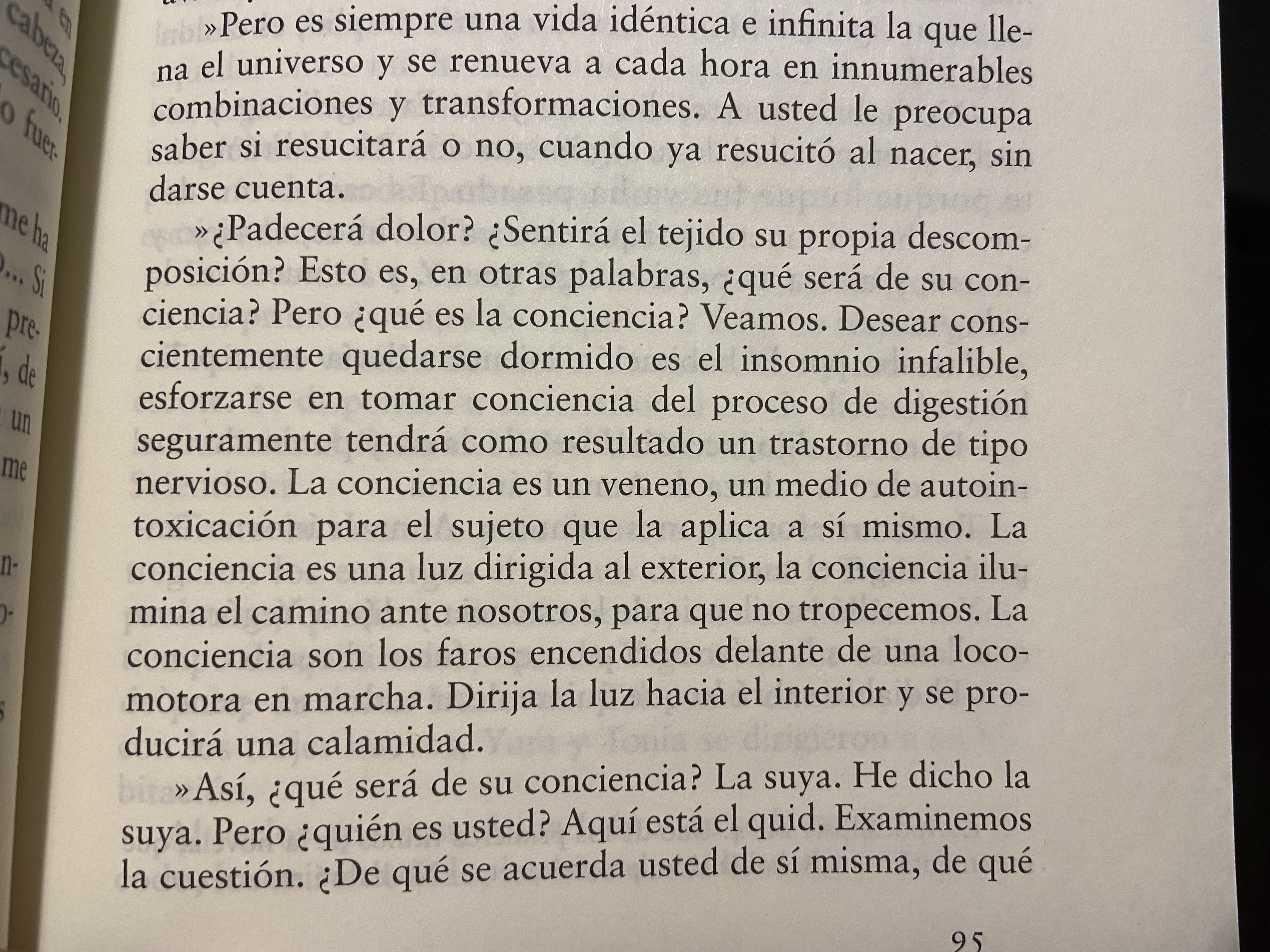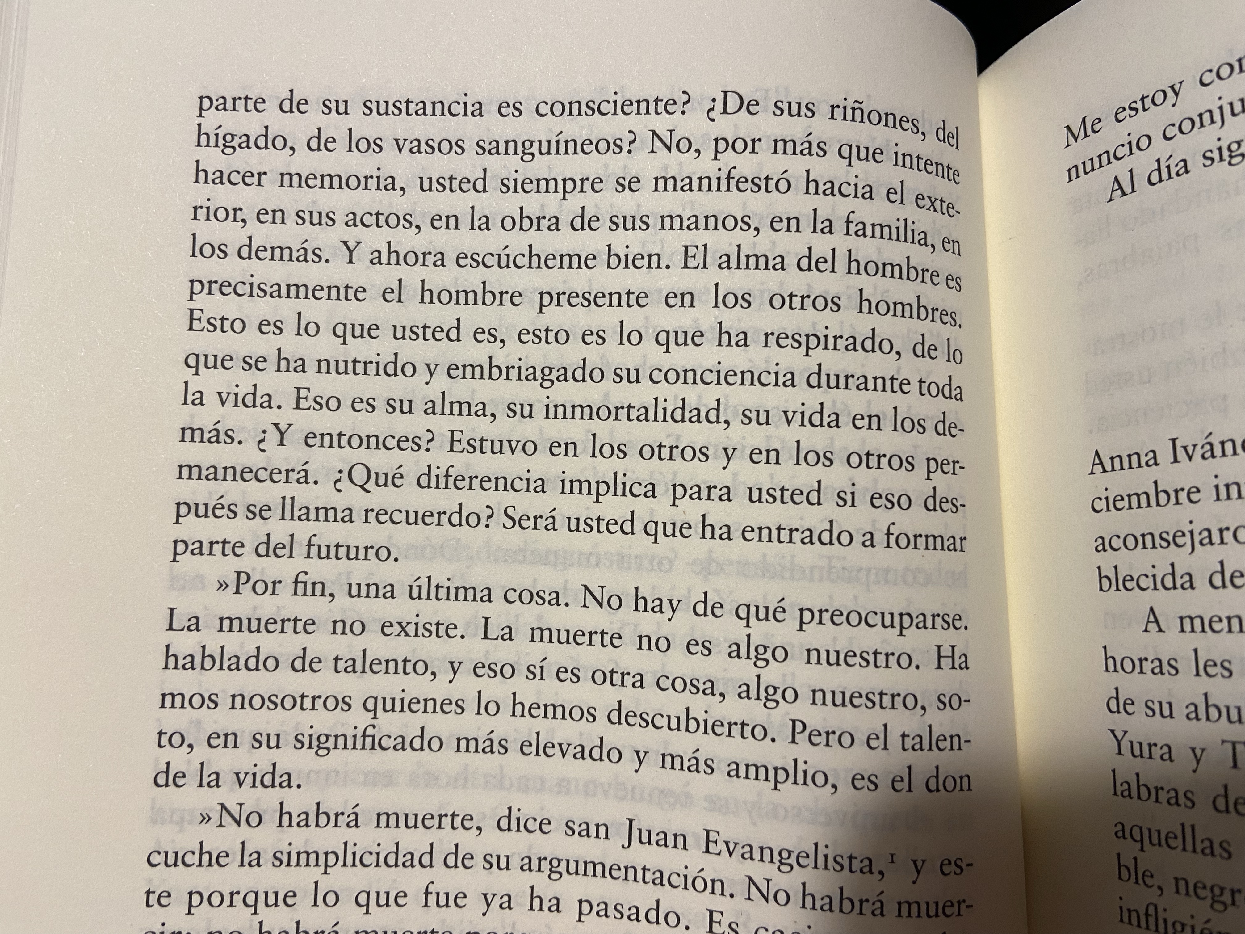 El manuscrito se titulaba “No habrá muerte” y en algún momento Boris Pasternak decidió cambiarlo a Doctor Zhivago, que quizás os suene. Éste es el fragmento donde al final aparece esa cita del Apocalipsis de San Juan, de donde se extrajo el título descartado. Yura le consuela a la enferma Anna Ivanovna, madre de su futura mujer, para que no tenga miedo de morir, y le explica qué cosa es en su opinión morirse, y no hay muerte en su idea de la muerte, pero tampoco conciencia. Quizás esto se parezca a lo que sospecho que es la muerte, en todo caso, fascinado con este pasaje y con este libro, y alegre de no haber visto la película aún y poder inventarme a Lara en mi imaginación.